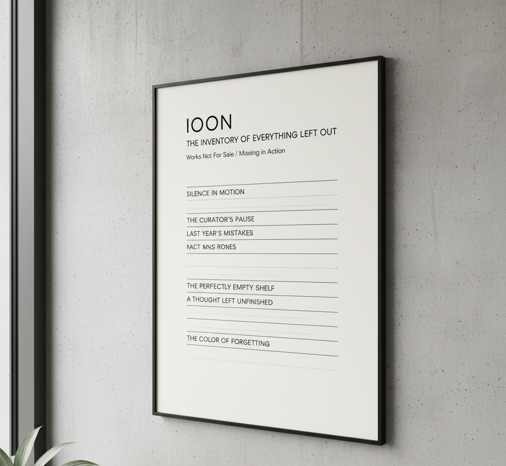 A large, minimalist print of “Inventory of Everything Left Out,” featuring a list of conceptual items that are not for sale (e.g., “Silence,” “The Curator’s Pause,” “Last Year’s Mistakes”). Only 49 numbered editions available.