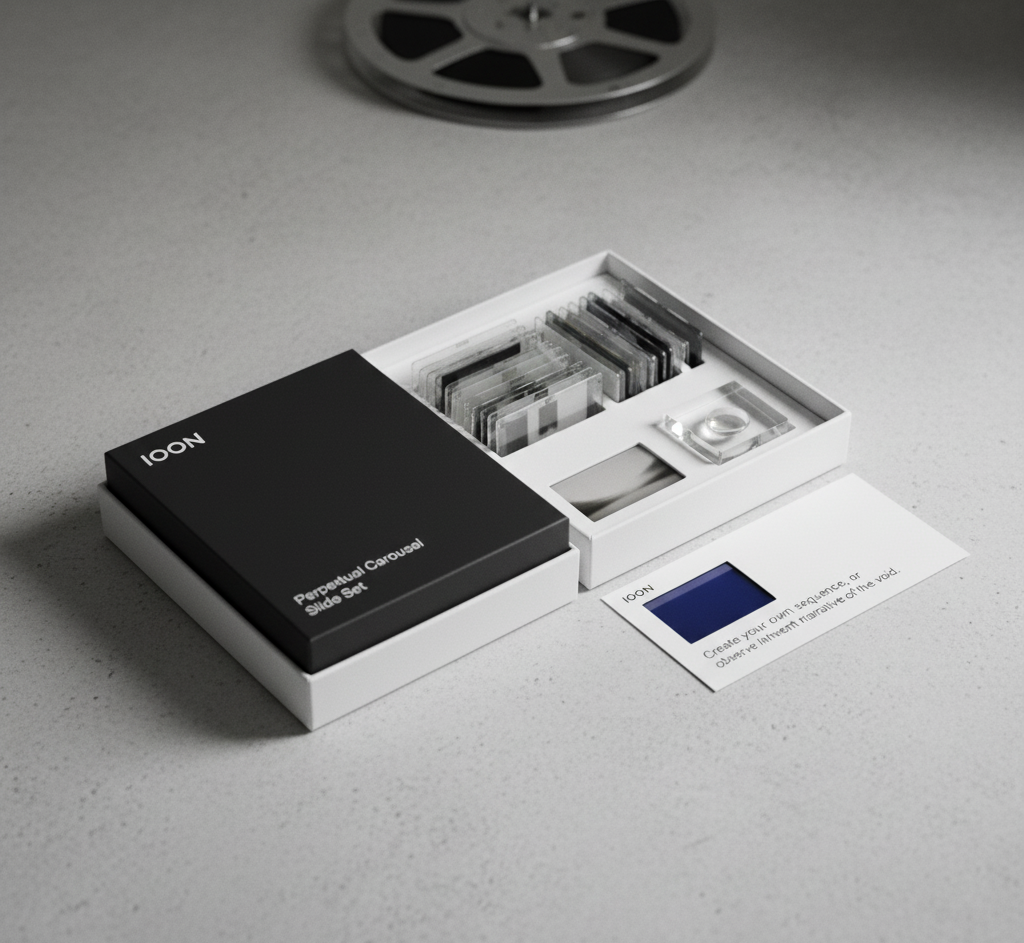 A set of 21 high-quality, blank or subtly altered dia slides, packaged in a sleek, minimalist box. Some slides might have a faint, almost imperceptible image (a partial text, a blurred landscape, or a single color field), while others are completely clear. The set includes a small, conceptual “viewfinder” (a simple acrylic block with a lens) and a card with instructions that invite the user to “create their own sequence, or observe the inherent narrative of the void.”