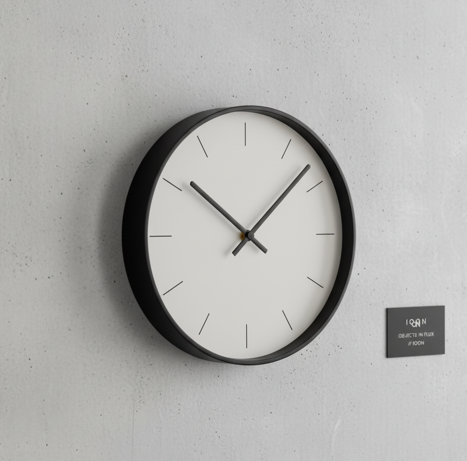 A minimalist wall clock where the hour and minute hands are identical and slightly misaligned, making precise reading confusing.